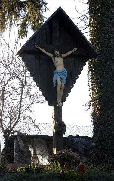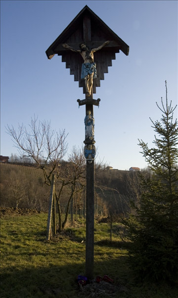 Križ naj bi dala postaviti Franc in Kristina Žugman leta 1929 zaradi obolenja in pogina živine oziroma kot zaobljubo pred nadaljnim poginom. Obnavljali so ga leta 1960 in leta 1997, ko ga je lastnik Peter Žugman prestavil bliže k hiši - prej je stal od 100 do 150 m niže od hiše ob gozdu ob pešpoti. Na razpelu so kipci Kristusa, Marije in angela.