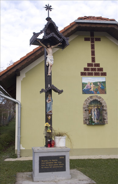 Današnji križ stoji od leta 2004 od gospodarskem poslopju. Lastniki (družina Kolman) so ga takrat obnovili in prestavili. Pred tem je stal približno 100 metrov stran od hiše ob poti. Razlog postavitve prvotnega križa ni znan, postavljen pa naj bi bil že nekje okrog leta 1900. Predvidevajo, da so ga dali postaviti predniki ali pa je križ že stal, ko so le-ti kupili posestvo. Danes lahko na njem preberemo posvetilo Prijatelj tu postoj, glej grešnik sem tvoj, glej na mojo desno stran, na mojih pet krvavih ran.