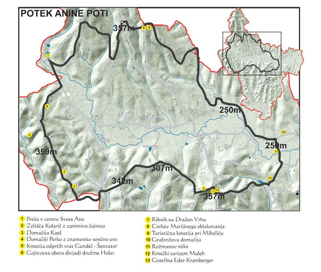 Začne se v središču Svete Ane v Slovenskih goricah, poteka skozi Dražen Vrh do Trat (občina Šentilj), kjer zavije pot skozi Lokavec vse do Rožengrunta, do znamenite cerkvice Marijinega obiskanja, od tam pa se vrača nazaj v center Občine Sveta Ana.